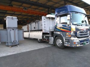 工場入り口から搬入された資材は、出口に向かって直線的に加工され、完成品となって搬出されます。